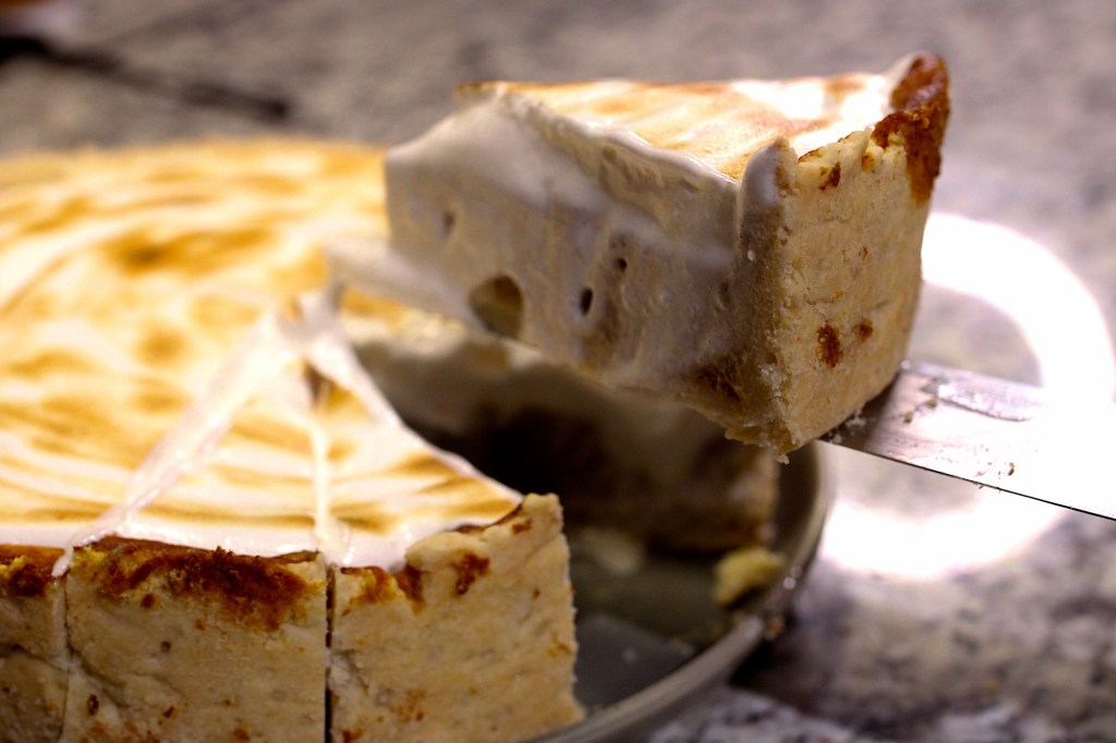 Spoon or pipe the meringue on top of the cooled pie and use a torch to gently toast until golden.