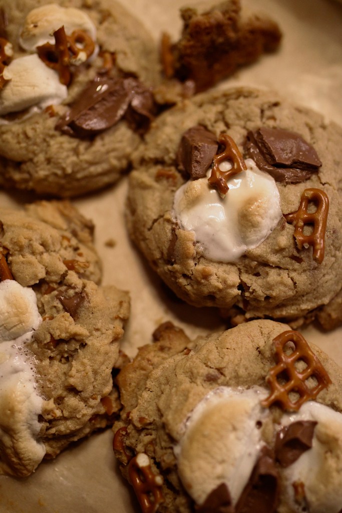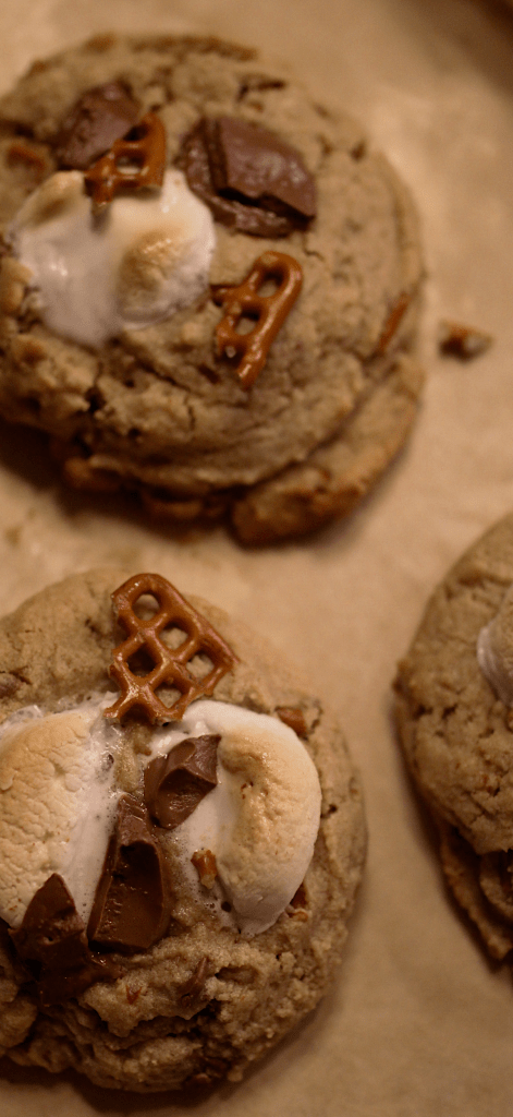 Today’s recipe is my personal favorite. I don’t have a big sweet tooth, but I’m a sl*t for a sweet and salty moment – so these really do it for me. The base cookie dough is soft and fluffy with enough density to hold all the fix-ins you could imagine. The peanut butter base is already a win for me, but pretzel pieces mixed in adds another layer of sweet and salty, top it with some milk chocolate chinks and big globs of gooey marshmallow? It’s purely entertaining to eat.